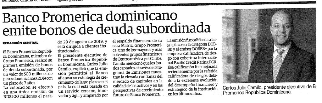 Banco Promerica dominicano emite bono de deuda subordinada