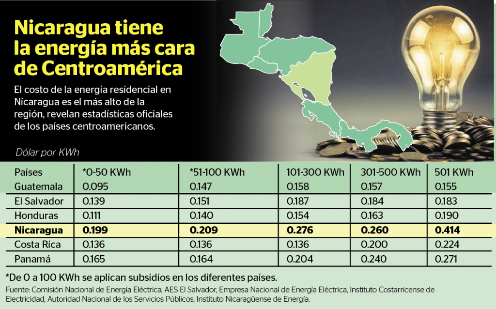 Desde el inicio de la crisis sociopolítica el costo de la energía eléctrica en Nicaragua ha venido incrementando silenciosamente de manera que si el país se compara con Guatemala —que tiene la energía más barata de la región— el costo de la electricidad en el sector residencial es un 165 por ciento más caro que en ese país.