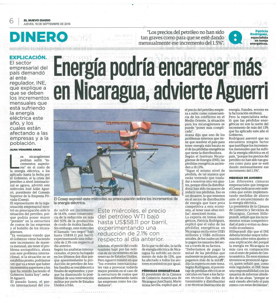Energía podría encarecer más en Nicaragua, advierte Aguerri