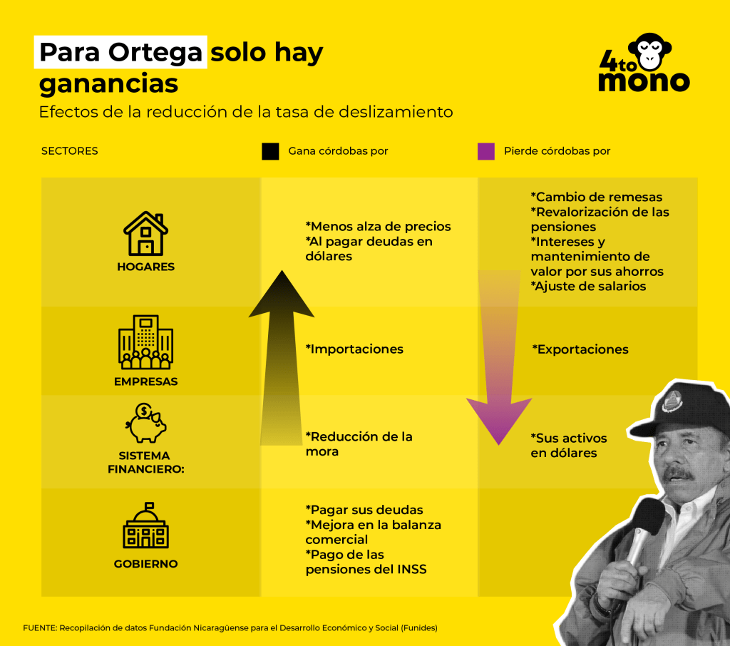 «Solamente el gobierno es el único ganador neto porque al requerir menos córdobas para comprar dólares, ahorrará una buena cantidad de dinero en el pago de la deuda pública; y si se ve por instituciones, al requerirse menos córdobas para importar se crea un incentivo a las importaciones que puede mejorar la balanza comercial, y el Instituto Nicaragüense de Seguridad Social (INSS), necesitará menos dinero para pagar las pensiones», detalla el análisis de Funides.