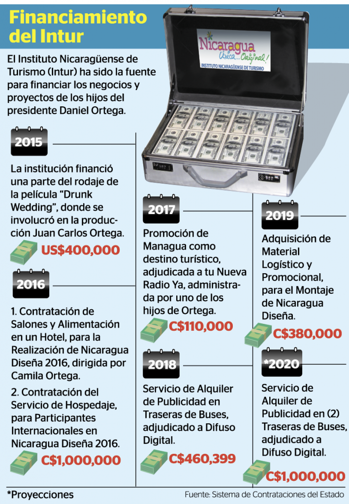 El 2020 no será la excepción. El Ministerio de Hacienda y Crédito Público le asignó al Intur para el próximo 67.94 millones de córdobas en servicio de publicidad y propaganda, una parte de estos recursos irán a parar a los negocios de los hijos de la familia presidencial, pese a que la Ley 737, Ley de Contrataciones Administrativas del Sector público se lo prohíbe.