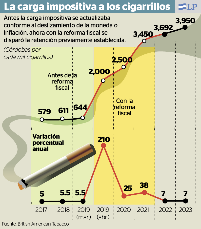 Además de provocar la pérdida del 30 por ciento de su planilla a British American Tabacco- que abastece el 92 por ciento del mercado legal de cigarrillo en Nicaragua- la reforma a la Ley de Concertación Tributaria también causará que el Estado deje de percibir 800 millones de córdobas en impuestos por menores importaciones y ventas de este producto.