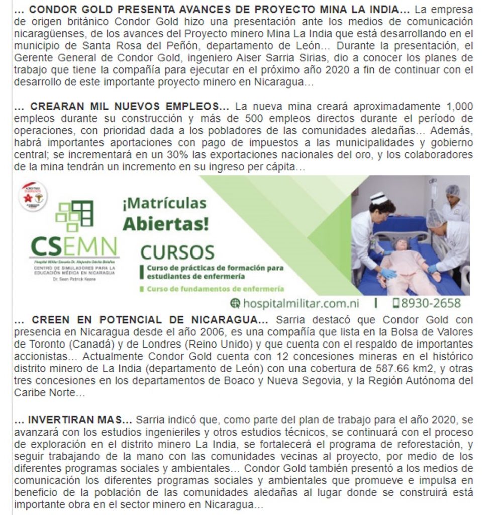 Condor Gold presenta avances de proyecto Mina La India