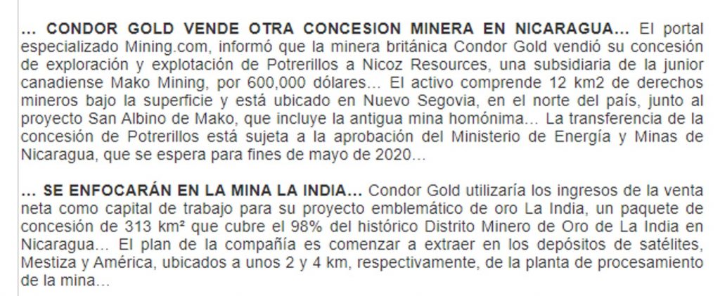 Condor Gold vende otra concesión minera en Nicaragua