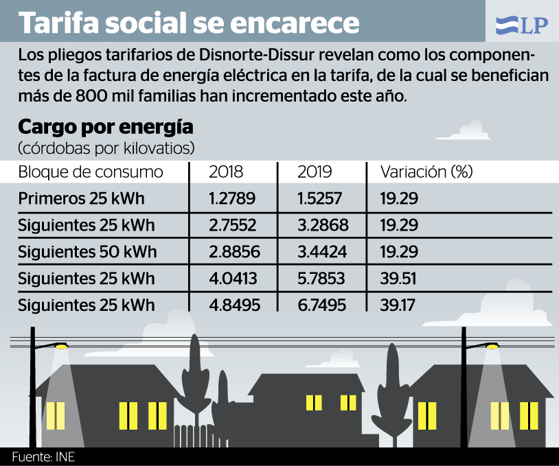 Pese al creciente desempleo y pobreza en Nicaragua, el régimen de Daniel Ortega a través del Instituto Nicaragüense de Electricidad (INE) aplicó de manera discrecional un fuerte incremento en la tarifa eléctrica, lo que golpeó particularmente la tarifa domiciliar y que en enero de 2020 se sentirá con mayor peso luego que entre en vigencia el tercer recorte de la cobertura del subsidio eléctrico pactado con el Banco Interamericano de Desarrollo (BID).