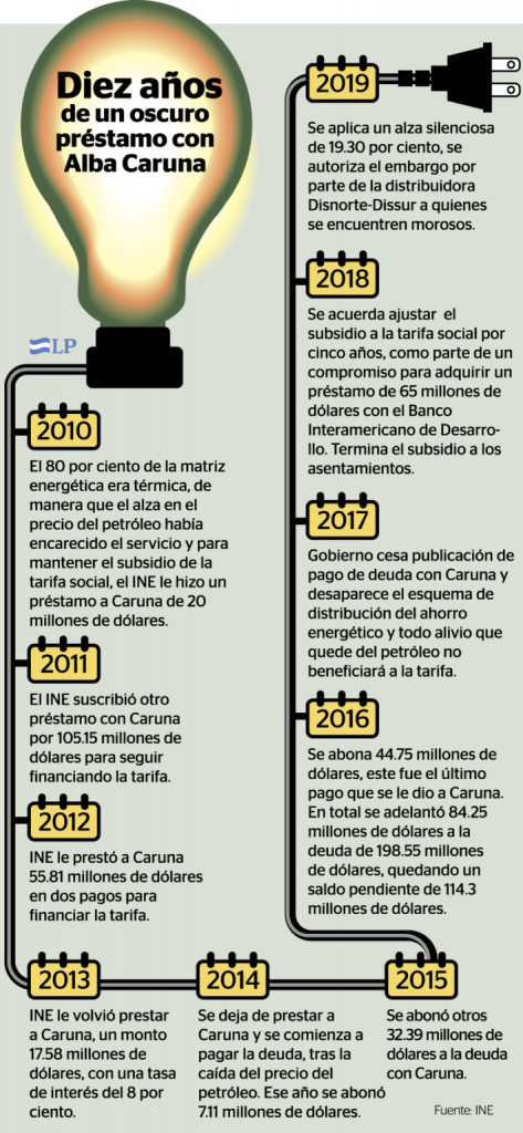 En ese escenario entró el Instituto Nicaragüense de Energía (INE), que recurrió a Caruna en el 2010 para contratar millonarios préstamos con la excusa que era para financiar el subsidio a la tarifa energética. En un inicio se vendió la idea que era parte del festín de la cooperación venezolana, pero luego el régimen sorprendió al anunciar que se debía pagar los adeudos.