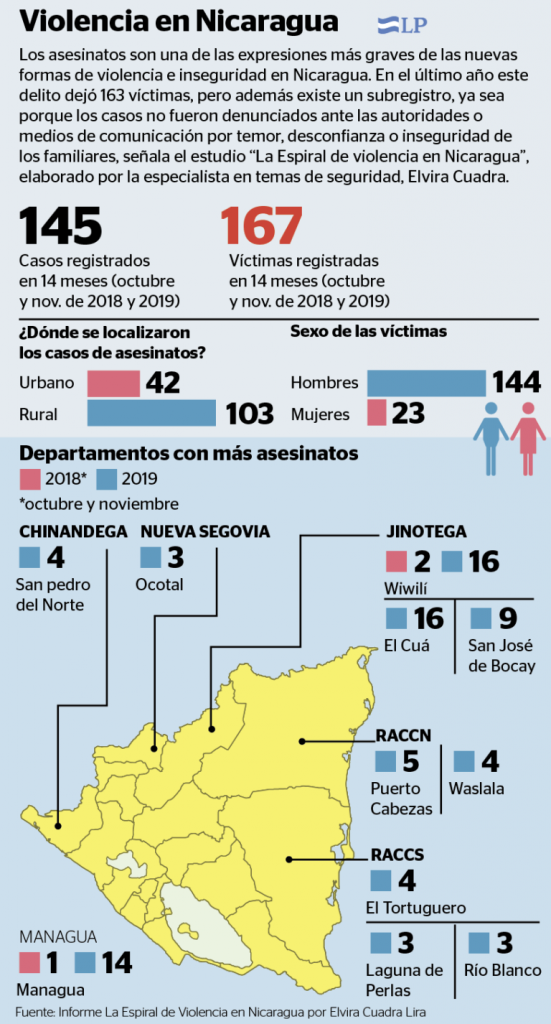 Durante el 2019, 163 personas fueron asesinadas en el país, una expresión del traslado de la violencia política de la ciudad hacia las zonas rurales, en un contexto de inseguridad, violencia y represión desde abril de 2018, revela el informe “La Espiral de la Violencia en Nicaragua”, elaborado por la experta en temas de seguridad, Elvira Cuadra.