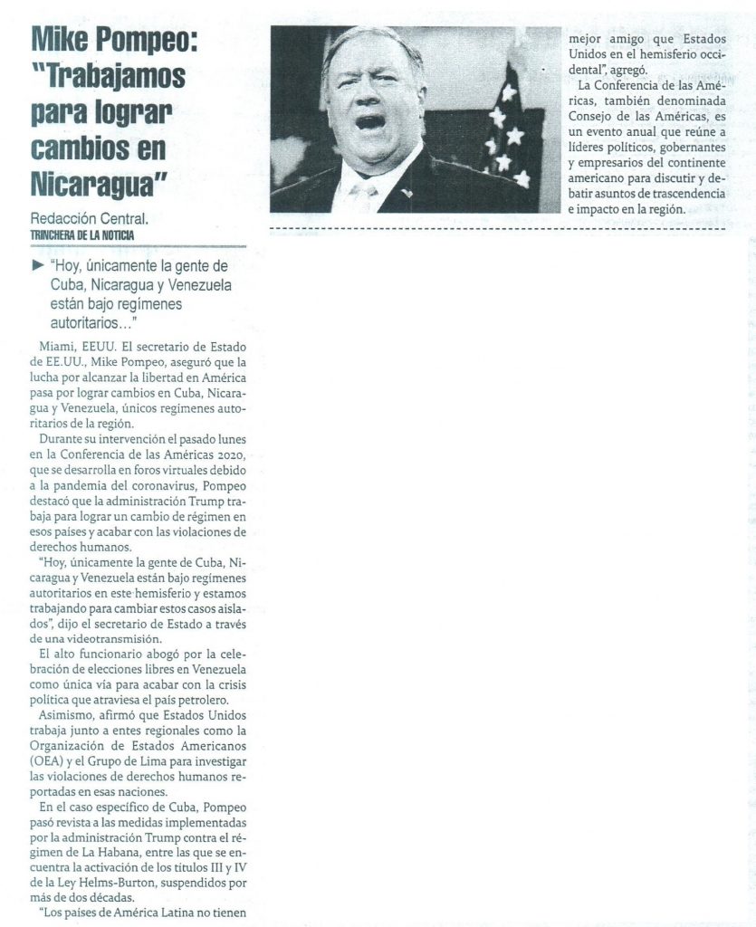 Mike Pompeo: » Trabajamos para lograr cambios en Nicaragua»