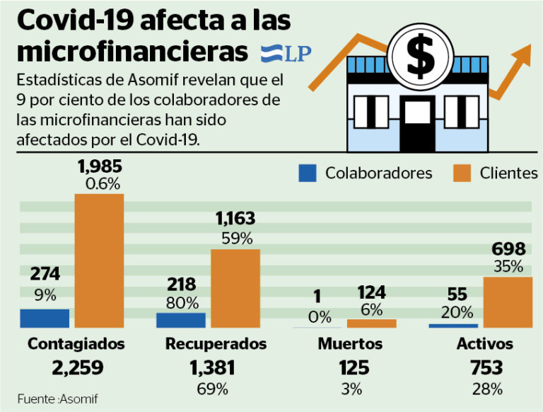 Según información de la Cámara de Microfinanzas hasta junio se reportan 1,985 clientes contagiados de Covid-19, de los cuales han muerto 124. De igual se contabilizan 274 trabajadores infectados, lo que representa el 9 por ciento del total de empleados que tienen emplanilla las entidades dedicadas al microcrédito asociadas a Asomif y que están presentes en todos los rincones del país.