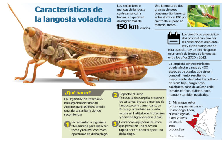 “La plaga de la langosta se da todos los años. Nicaragua tiene un programa de vigilancia fitosanitaria y el Organismo Regional de Sanidad Agropecuaria (Oirsa) es el que lidera en ese caso junto con el Ipsa todos esos programas, lo que pasa ahorita es que hay un estado de alerta porque en muchos países se ha detectado lo que se le llama mangas, que es una conglomeración de focos”, sostuvo.
