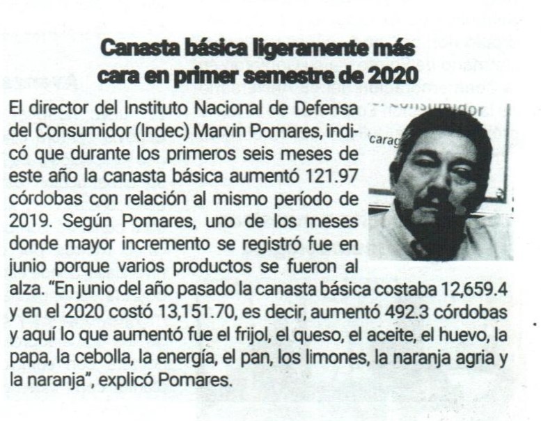 Canasta básica ligeramente más cara en primer semestre de 2020