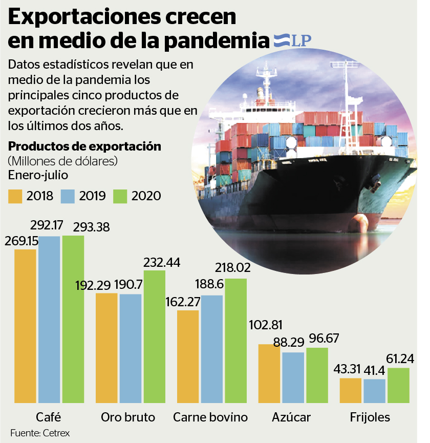 Hasta julio los principales diez productos de exportación fueron: café,  oro en bruto, carne de bovino, azúcar de caña, frijoles, maní, camarón de cultivo, queso morolique, tabaco en rama y pescado.