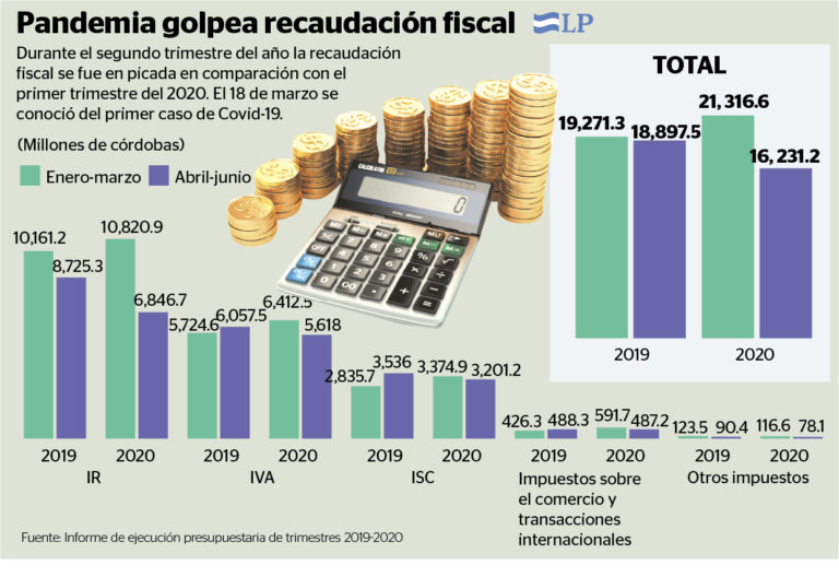 Sin embargo, en el primer trimestre el IVA recaudó 6, 412.5 millones, pero en el segundo se contrajo, apenas llegó a 5, 618 millones. Una situación similar sucedió con el Impuesto Selectivo al Consumo (ISC), que aseguran incrementó 3.2 por ciento en comparación con 2019. Al ver las cifras de los trimestres de este año por separados, este impuesto ni siquiera llegó a los 3, 374.9 millones de córdobas obtenidos de enero a marzo de 2020. Ver infografía arriba