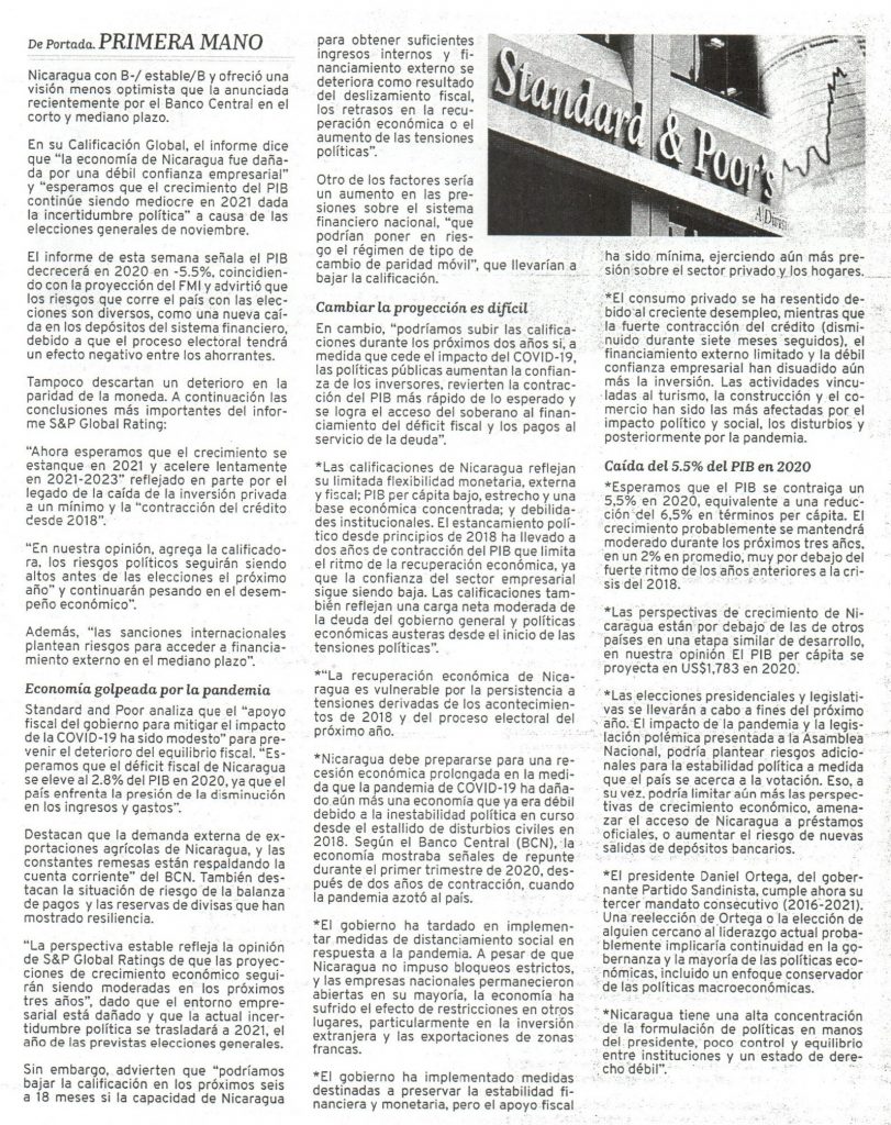 Calificadora de riesgos tiene otra visión sobre Nicaragua
