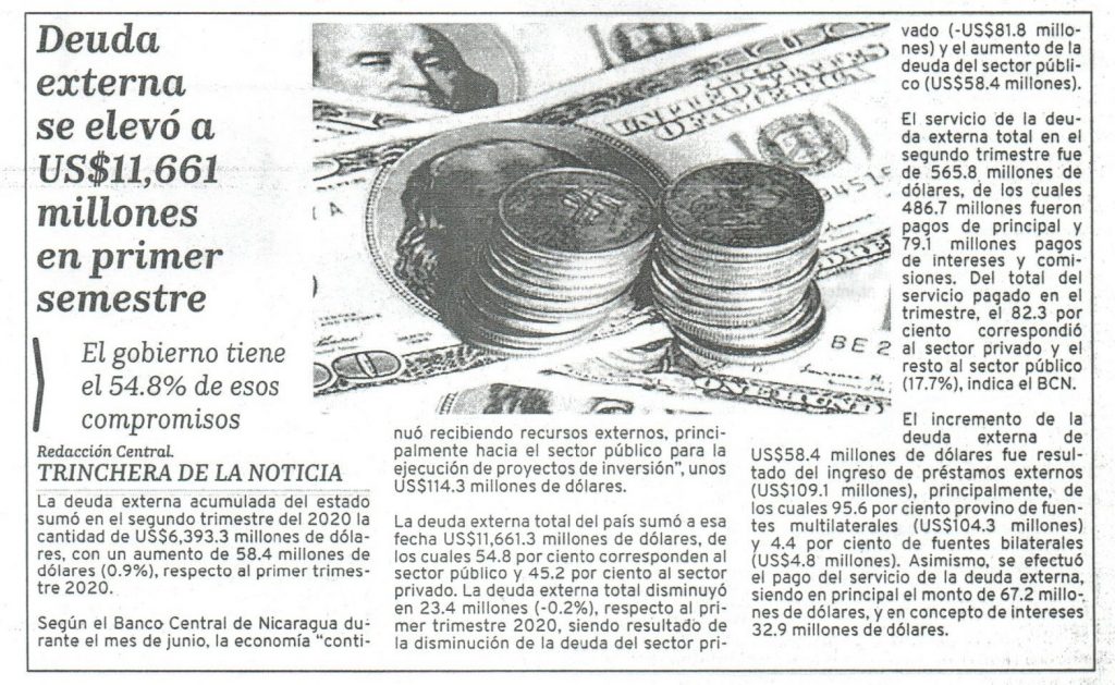 Deuda externa se elevó a US$11,661 millones en primer semestre