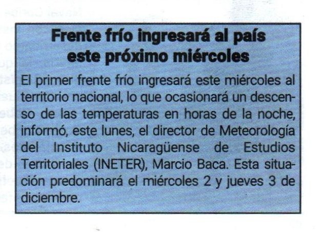 El primer frente frío ingresará este martes al territorio nacional, ocasionando un descenso de las temperaturas en horas de la noche, así lo informó este lunes Marcio Baca, director de Meteorología del Instituto Nicaragüense de Estudios Territoriales (INETER).