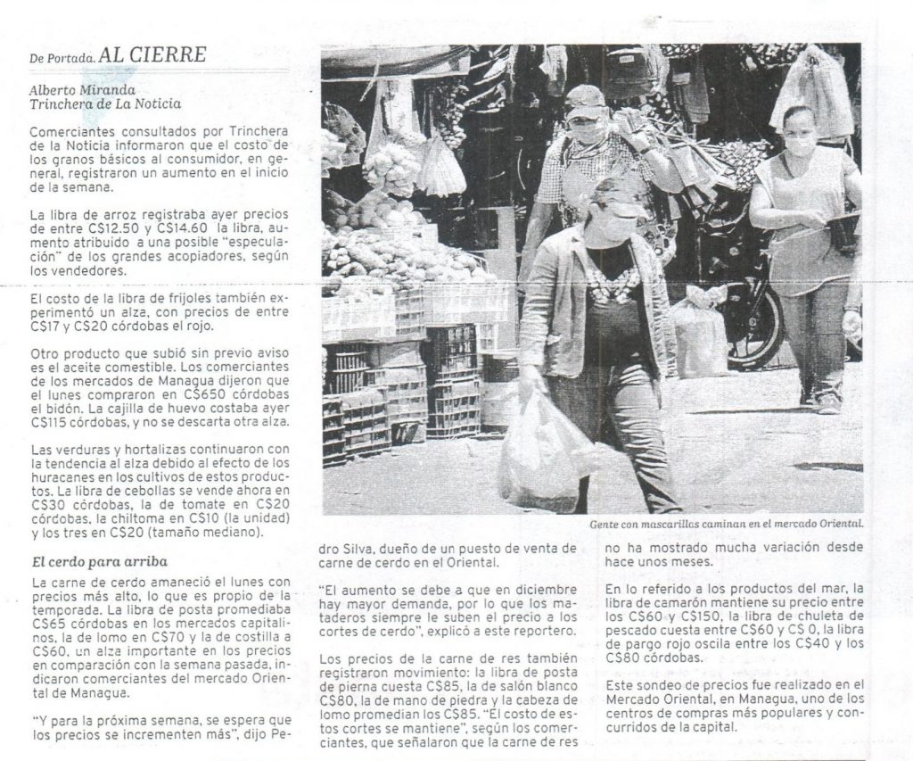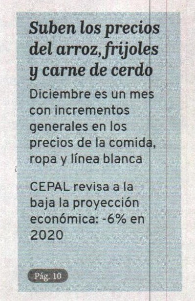 Mientras que la posta de res, queso seco, plátano y papas presentan una baja de precios. A la lista de productos que mantuvieron precios se encuentra el arroz, tanto en su presentación de setenta y ochenta por ciento grano entero, azúcar sulfitada, frijoles rojos; aceite sellado, aceite a granel, pollo entero, pierna de pollo, muslo de pollo, pierna con muslo, pechuga, posta de cerdo y el pan.
