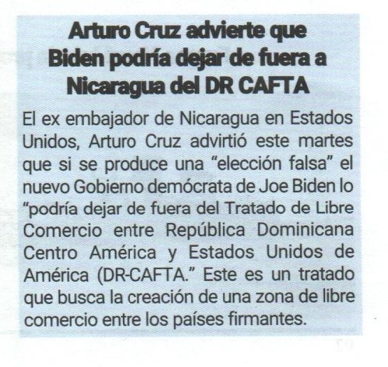 Arturo Cruz advierte que Biden podría dejar de fuera a Nicaragua del DR CAFTA