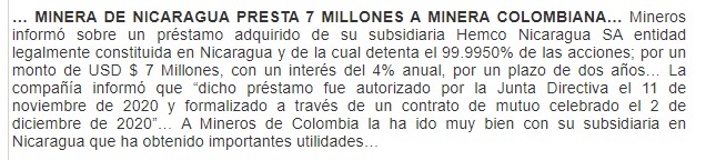Minera de Nicaragua presta 7 millones a minera colombiana