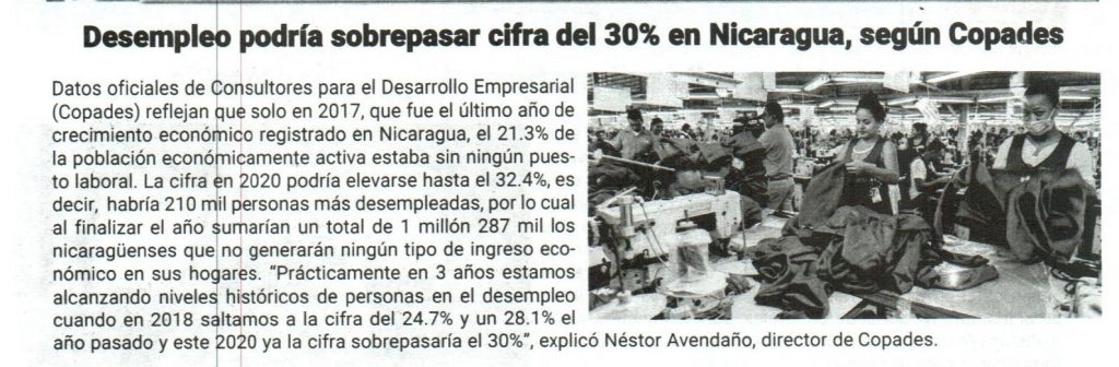 Desempleo podría sobrepasar cifra del 30% en Nicaragua según Copades