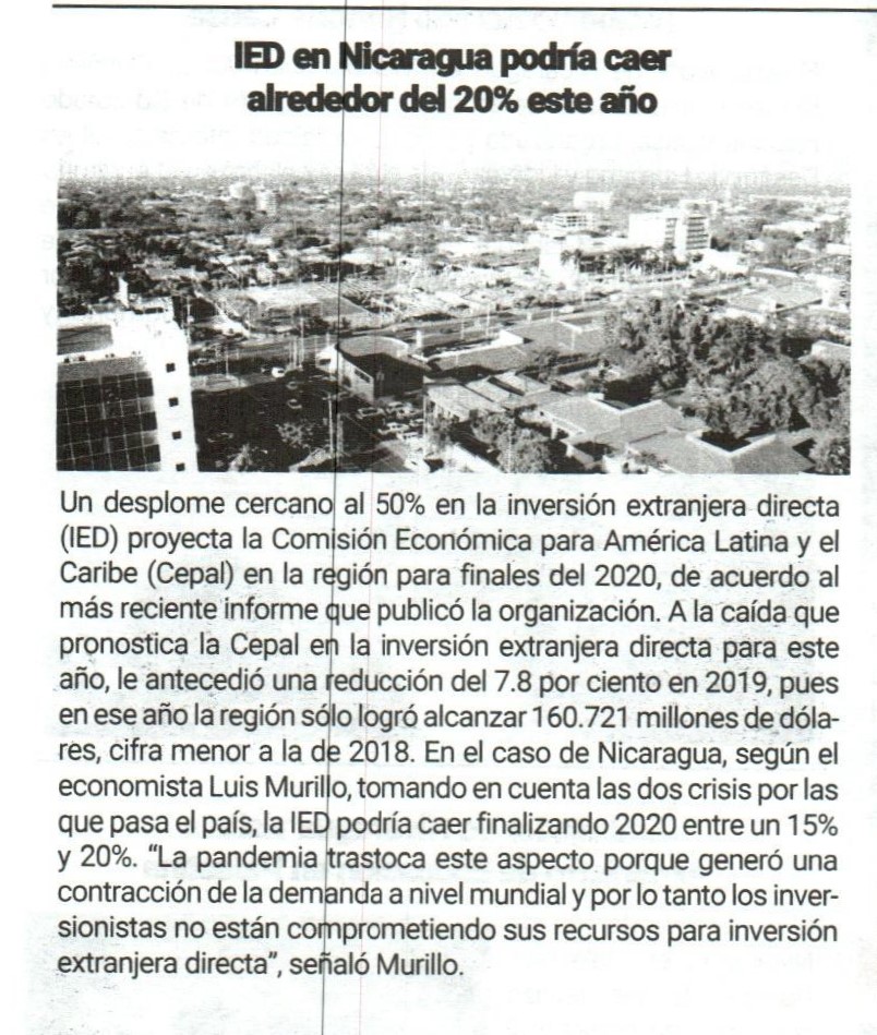 IED en Nicaragua podría caer alrededor del 20% este año