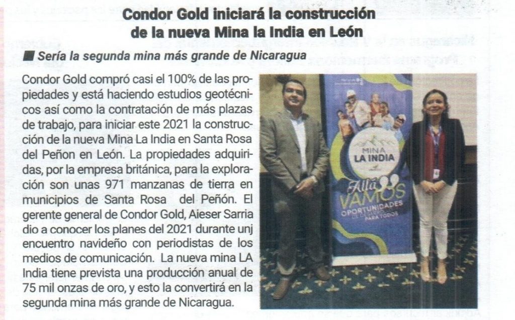 Condor Gold iniciará la construcción de la nueva Mina la India en León