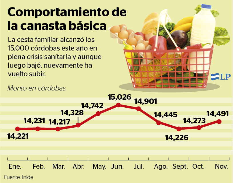 El costo total de la canasta básica tuvo en noviembre de este año un tercer aumento consecutivo al subir 218 córdobas, lo que ocasionó que la cesta se ubicara en 14,491.96 córdobas, de los cuales 9,673 córdobas corresponden a alimentos, según informó el Instituto Nacional de Información de Desarrollo (Inide).
