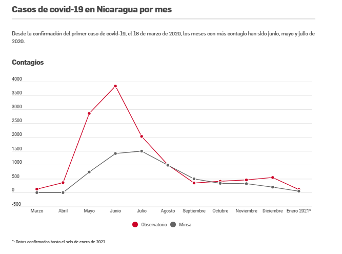 Desde la llegada de la pandemia a Nicaragua, los meses que más casos se reportaron fueron mayo y junio. Después hubo un descenso sostenido en los contagios y muertes, que llevó, incluso, al Observatorio Ciudadano a registrar menos contagios que el Minsa en el mes de septiembre.