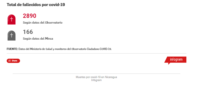 “Siempre hemos dicho que no tenemos capacidad para recolectar el 100% de los casos de covid-19. (Pero) el Observatorio tiene más capacidad de recolectar información sobre los fallecimientos”, explicó a CONFIDENCIAL un miembro del Observatorio, cuya política es mantener cualquiera de sus identidades en el anonimato, para evitar represalias que obstaculicen su labor ante la pandemia.