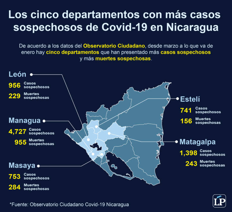 Estos cinco departamentos son los que presentan más muertes sospechosas, aunque el orden varía un poco en la cantidad respecto a los contagios. Managua siempre se coloca al frente de la lista con 951 muertes sospechosas, seguido de Masaya con 284, Matagalpa con 243, León con 229 y Estelí con 156.