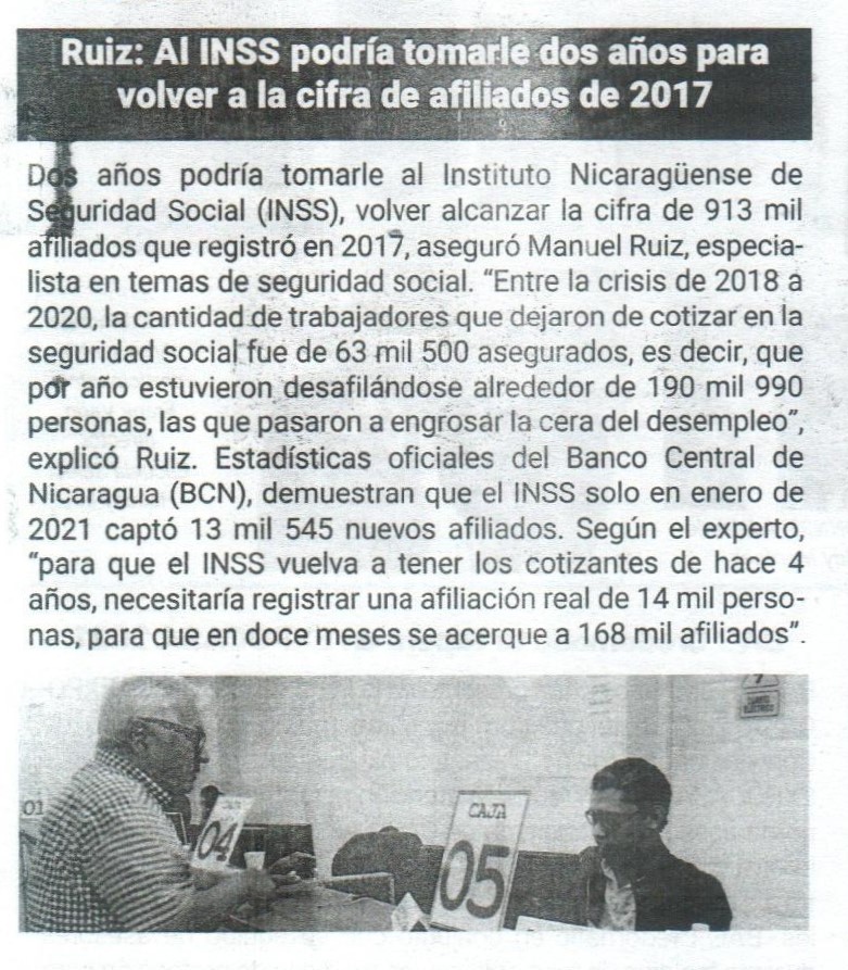 Ruiz: Al INSS podría tomarle dos años para volver a la cifra de afiliados de 2017