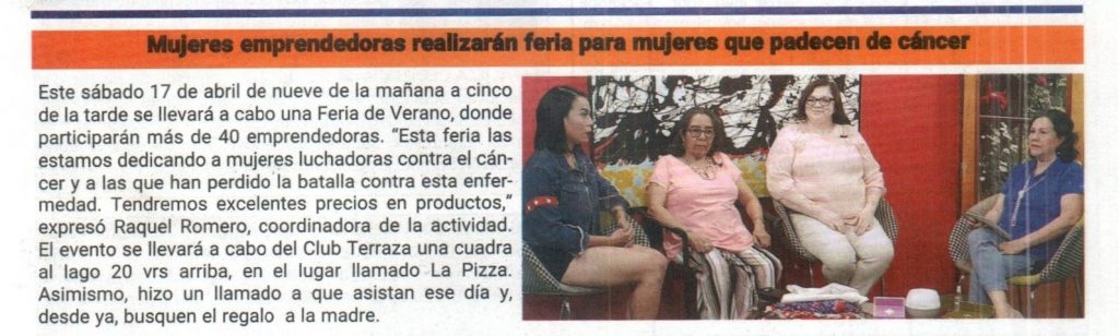 Mujeres emprendedoras realizarán feria para mujeres que padecen de cáncer