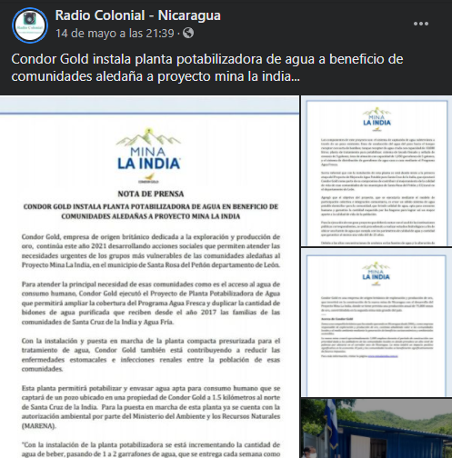 Condor Gold instala planta potabilizadora de agua a beneficio de comunidades aledaña a proyecto mina la india…