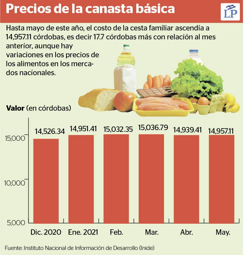 Según cifras publicadas por el Inide, la mayor alza en la canasta básica se registra este año en los alimentos, los que representan el 67 por ciento del total de la cesta familiar, al pasar de 9,681.5 córdobas en diciembre de 2020 a 10,026.61 córdobas en mayo de 2021.