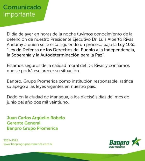 Comunicado BANPRO ante detención de Luis Rivas