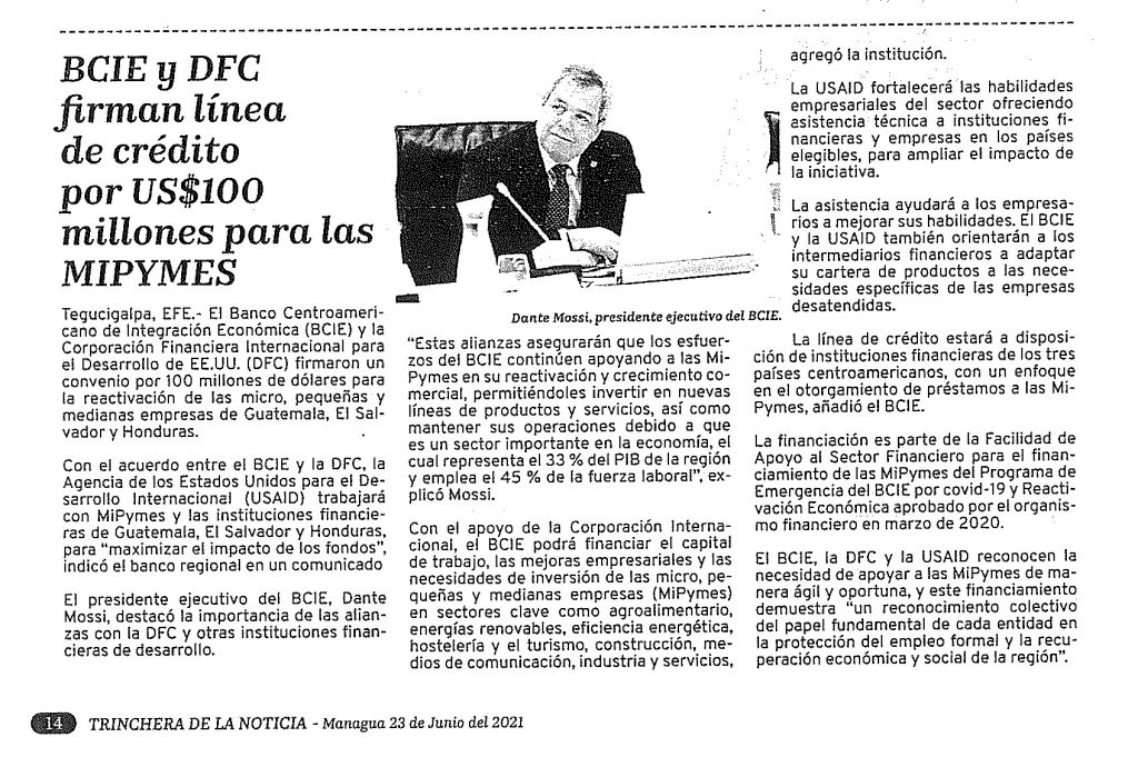 BCIE y DFC firman línea de crédito por U$100 millones para las MIPYMES