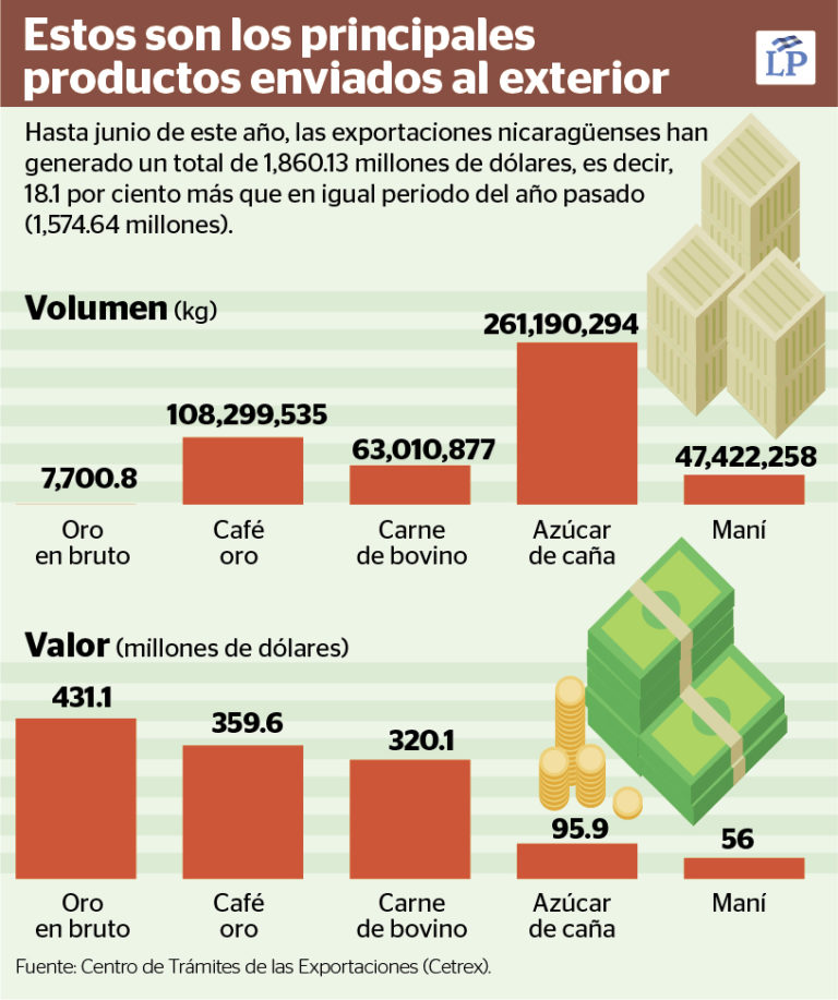 Hasta junio, la lista de los diez productos más exportados en Nicaragua está conformada por oro en bruto, café oro, carne de bovino, azúcar de caña, maní, frijoles, camarón de cultivo, queso morolique; así como la sección de bebidas, líquidos alcohólicos, vinagre, y el pescado.