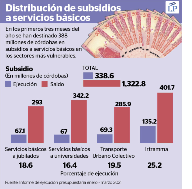 Hasta el primer trimestre del año se ha destinado un total de 338.6 millones de córdobas en concepto de subsidios para distintos sectores sociales, lo que incluye: transporte, universidades y jubilados, según detalla el Informe de Ejecución Presupuestaria de enero a marzo del 2021. Los números muestran que aunque este año el monto asignado para estos programas es casi similar a lo del año pasado, el fondo se ha venido ejecutando con mayor lentitud.