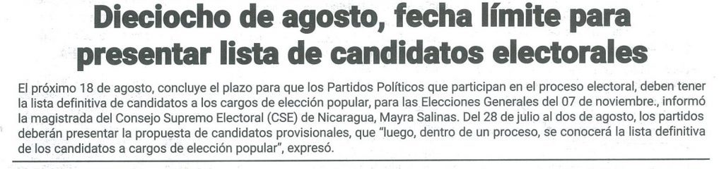 Dieciocho de agosto fecha límite para presentar lista de candidatos electorales