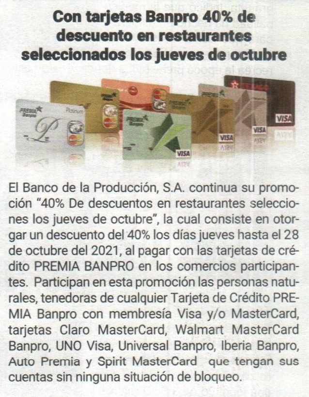 Con tarjetas Banpro 40% de descuentos en restaurantes seleccionados los jueves de octubre