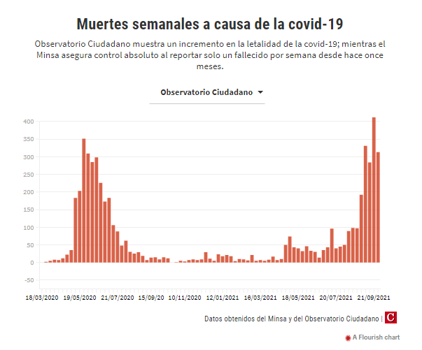En los reportes, lo mismo ocurre con la cifra de muertes semanales. El Observatorio ha revelado un récord de 419 decesos semanales, que supera las 351 muertes reportadas en mayo de 2020; aunque el Minsa mantiene invariable el dato de una sola muerte por covid-19 cada semana.