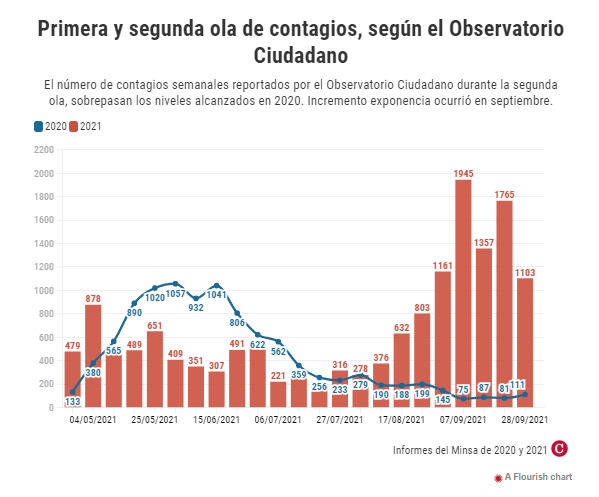Los reportes del Minsa y el Observatorio superan también, por separado, los récord semanales de contagios que se registraron durante la primera ola de 2020. Aquel año, el máximo registrado por el Minsa fue de 480 casos en una semana, y el pasado 28 de septiembre la misma entidad reportó 718 contagios en siete días. Igualmente, el Observatorio informó un récord de 1057 contagios en una semana de 2020, y ahora ese pico fue de 1945 el pasado ocho de septiembre.