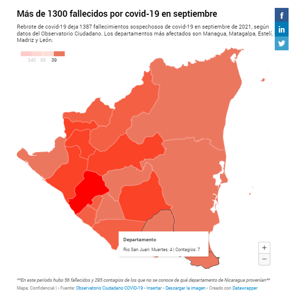 Además, el 62.8% de las muertes sospechosas de covid-19, reportadas por el Observatorio Ciudadano durante septiembre, se registraron en cinco departamentos: Managua (340), Matagalpa (185), Estelí (123), León (115) y Madriz (108).
