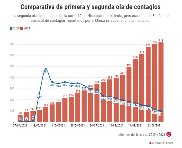 Un análisis de los datos oficiales e independientes, realizado por CONFIDENCIAL, confirma que en las últimas nueve semanas los contagios y muertes por covid-19 han aumentado en Nicaragua. En este período, el Minsa admitió 4978 casos positivos y nueve fallecidos, mientras el Observatorio Ciudadano registró 9420 contagios y 1873 muertes sospechosas de covid-19.