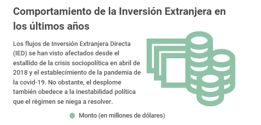 En el Programa Económico y Financiero de 2020-2024 el régimen proyecta captar en ese periodo unos 1,006.3 millones de dólares en IED, monto que no supera lo que se recibió en 2017, cuando el saldo ascendió a 1,035.4 millones de dólares.