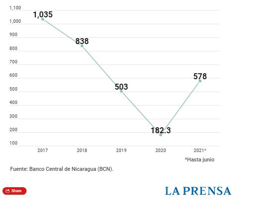 En el 2017, entre enero y junio, un año antes del estallido social, Nicaragua captó en inversión foránea 549.7 millones de dólares, es decir un poco menos de lo observado este año, y en el 2018 en similar lapso, ya con el impacto de la crisis política, esta ascendió a 554.1 millones de dólares. En el 2019 este indicador totalizó 275.6 millones de dólares.