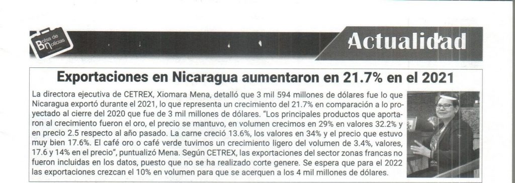 Exportaciones en Nicaragua aumentaron en 21.7% en el 2021