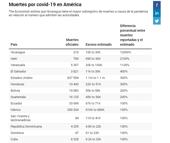 Nicaragua es el país de América que tiene el mayor subregistro de muertes por la covid-19 en relación a las cifras que reconoce el Ministerio de Salud (Minsa). Según una estimación hecha por el medio británico The Economist, en el país hay entre 10 000 y 30 000 fallecidos, una cifra 137 veces superior a los 218 muertos que se admiten oficialmente.