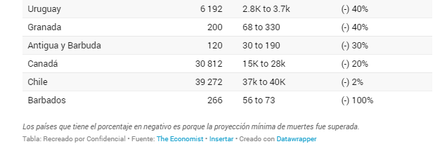 La unidad de datos de The Economist tuvo acceso a las cifras de mortalidad de 84 países de todo el mundo y también consideró más de cien otros indicadores estadísticos, que permitieron hacer estas estimaciones.