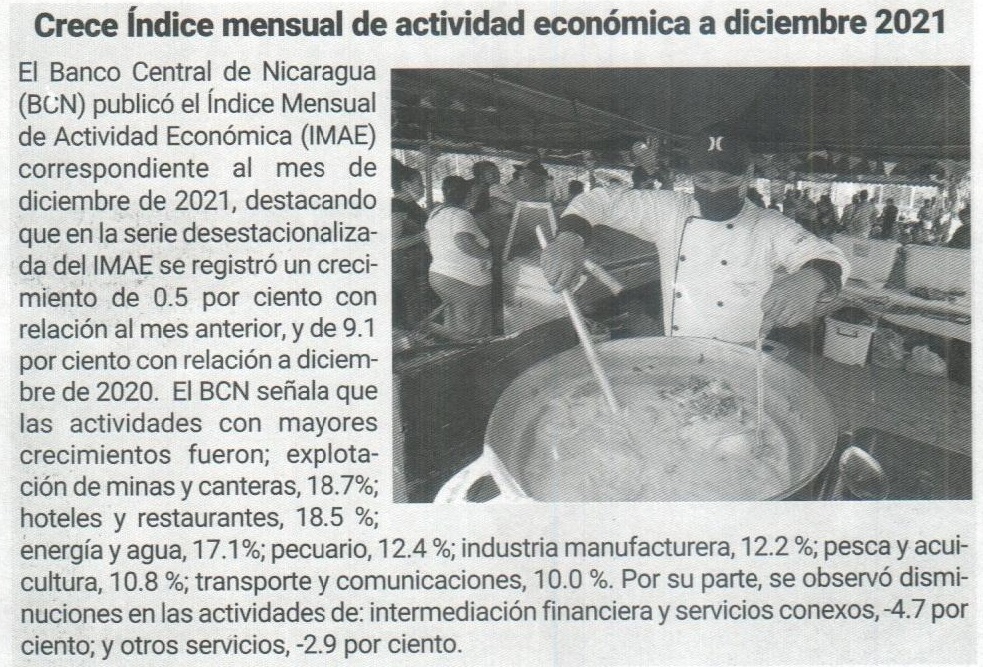 Crece índice mensual de actividad económica a diciembre 2021
